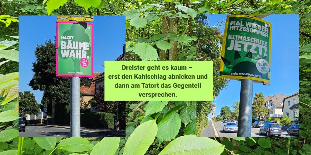 Es ist Wahlkampf in Hagen – und die Grünen zeigen sich wieder einmal von ihrer besten Seite. Entlang der Feithstraße in Sichtweite des Dünningsbruchs mahnen sie mit großen Lettern: „Klimaschutz jetzt!“ und „Macht Bäume wahr“. Klingt nach Haltung, klingt nach Konsequenz. Doch wer genauer hinsieht, erkennt den blanken Hohn. Denn die Wahrheit sieht anders aus – und sie ist eine schallende Ohrfeige für alle, die auf ehrliche Umweltpolitik hoffen.